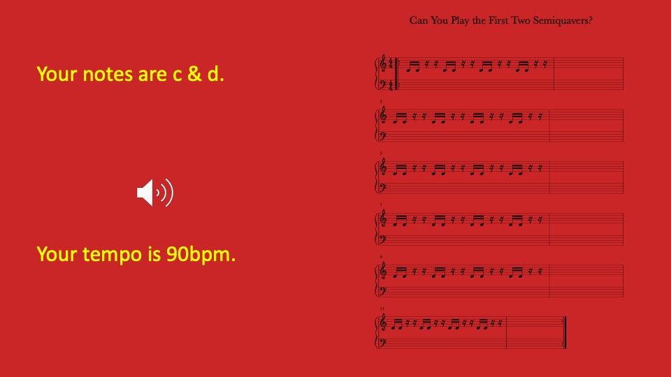 Play two semiquavers then rest for two with musical tracks guiding you to play together and on your own for a better understanding.