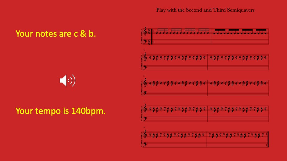 Rest one semiquaver, play two semiquavers then rest one semiquaver with musical tracks guiding you.